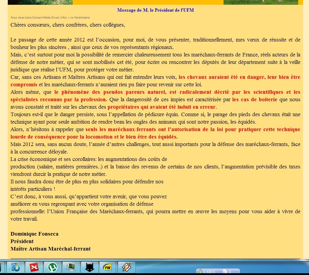 PS: Mon dossier de CQP est bloqué par la CMA de Vannes depuis plusieurs années… J’ai 13 ans d’activité or la loi sur les professions réglementé demande 3 ans… j’ai donc selon la loi, droit à la reconnaissance de mon expérience et au statut d’artisan maréchal… mais, mais, l’UFM est plus forte que la loi en France….
